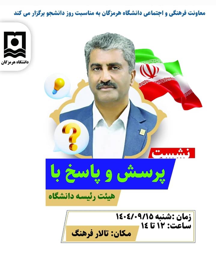 به مناسبت گرامیداشت روز دانشجو، معاونت فرهنگی و اجتماعی دانشگاه هرمزگان از تمامی دانشجویان عزیز دعوت می‌کند در نشست صمیمانه و گفت‌وگوی رو‌در‌رو با هیئت‌رئیسه دانشگاه شرکت کنند.